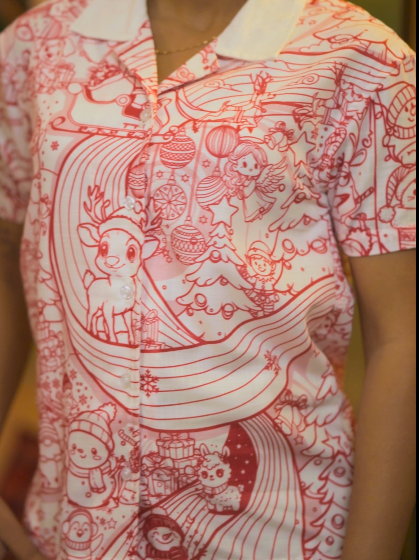 The highlight of the shirt is the exclusive Santa’s Merryful Journey doodle artwork—packed with adorable Christmas elements like Santa’s sleigh, reindeers, gifts, angels, snowmen, and more. Every inch of the shirt tells a story, making it the most eye-catching festive wear of the season.