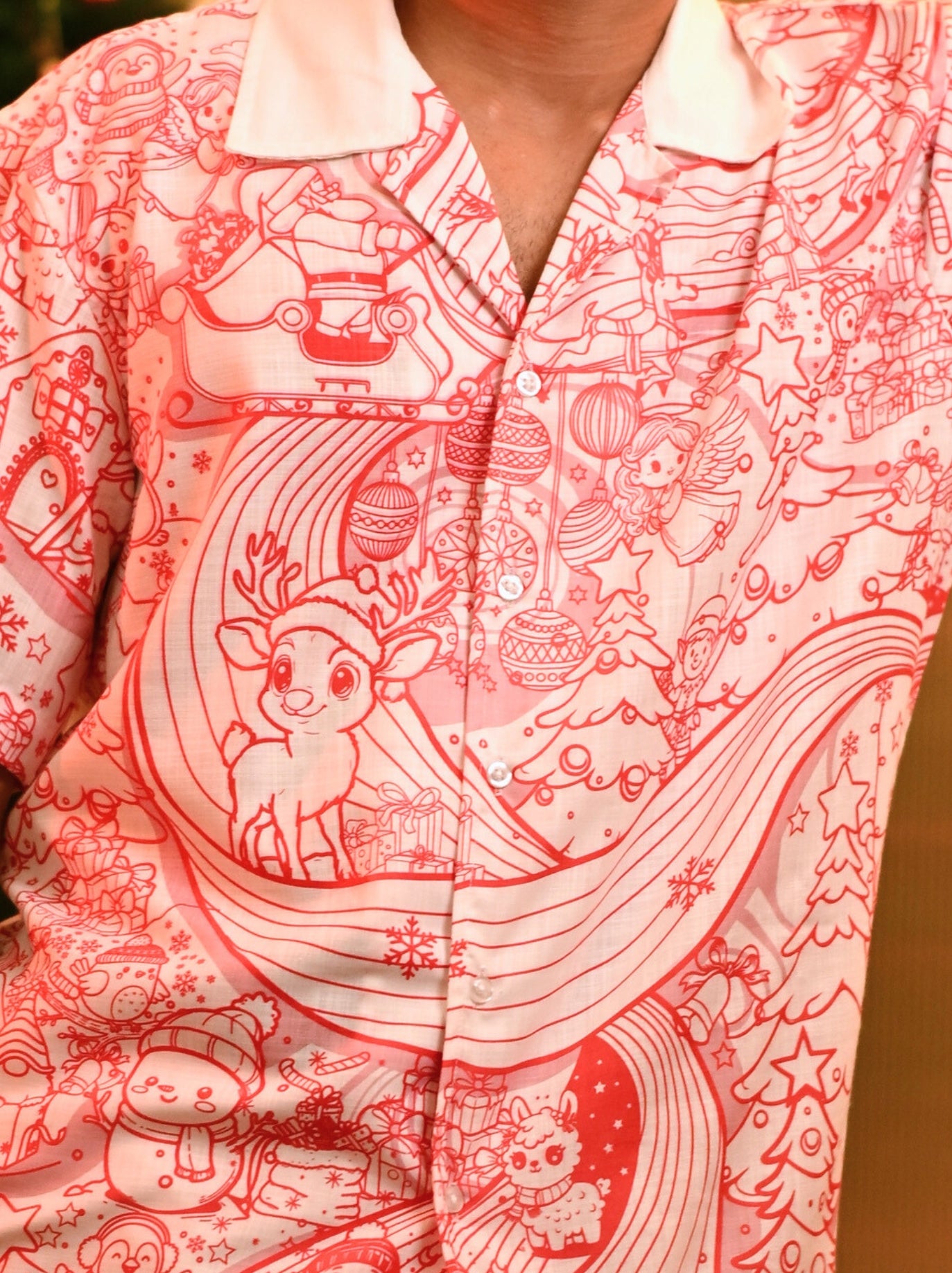 The highlight of the shirt is the exclusive Santa’s Merryful Journey doodle artwork—packed with adorable Christmas elements like Santa’s sleigh, reindeers, gifts, angels, snowmen, and more. Every inch of the shirt tells a story, making it the most eye-catching festive wear of the season.